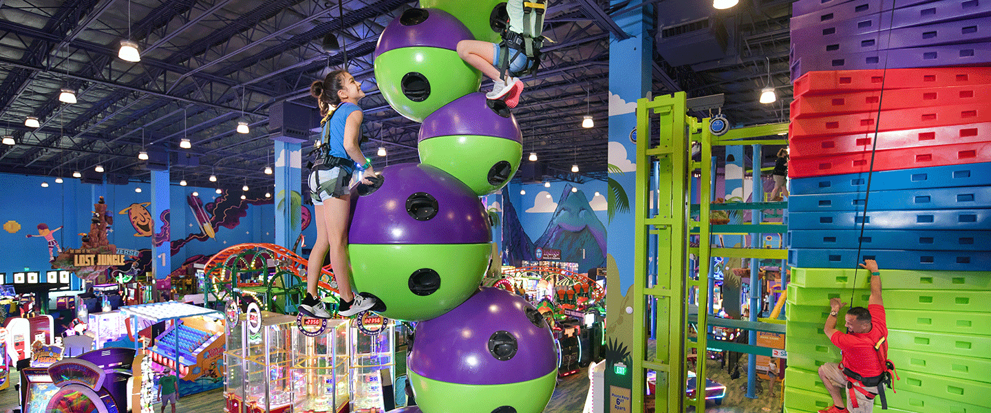 Our 80,000 square foot indoor theme park has it all - a ropes course, climbing obstacles, zip line, bowling, laser tag, go-karts, mini golf, and 250 of the best arcade games.